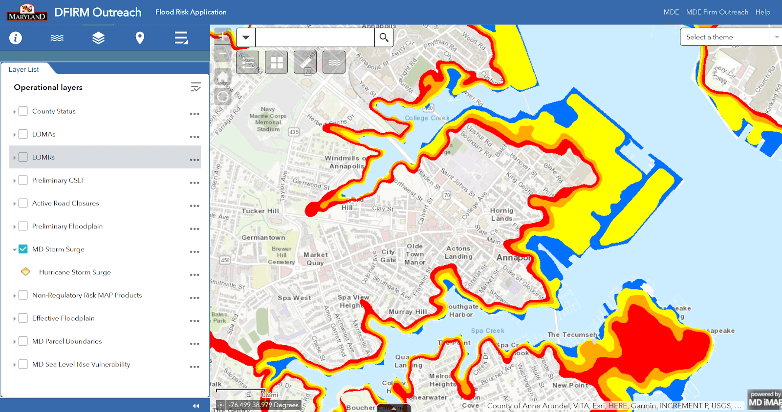 Before you buy, consult flood maps to better focus your search. The image below from mdfloodmaps.net shows the extent of possible hurricane storm surge in Annapolis. You can zoom in on these maps to discover whether a listing is in the danger zone or to identify areas to avoid and those that lie at a safe elevation.